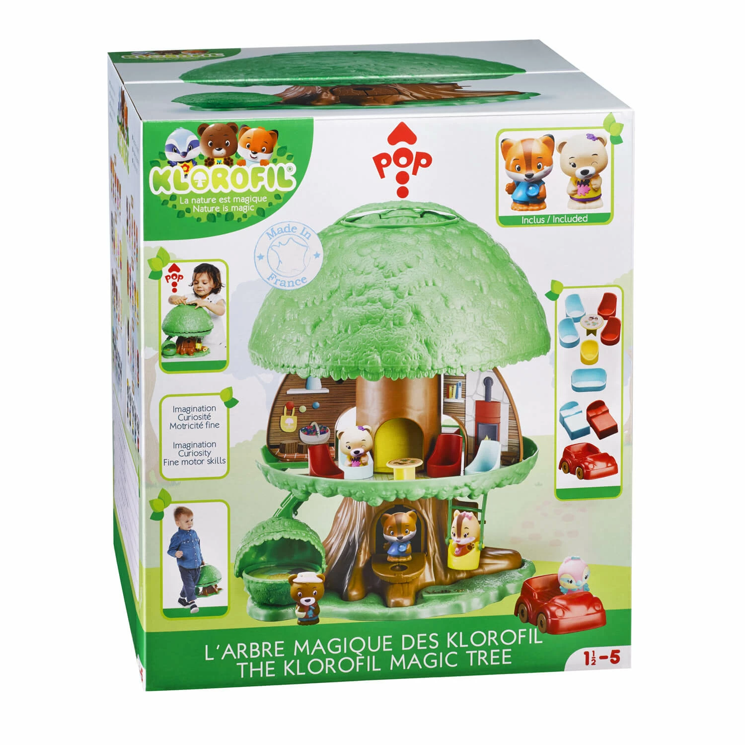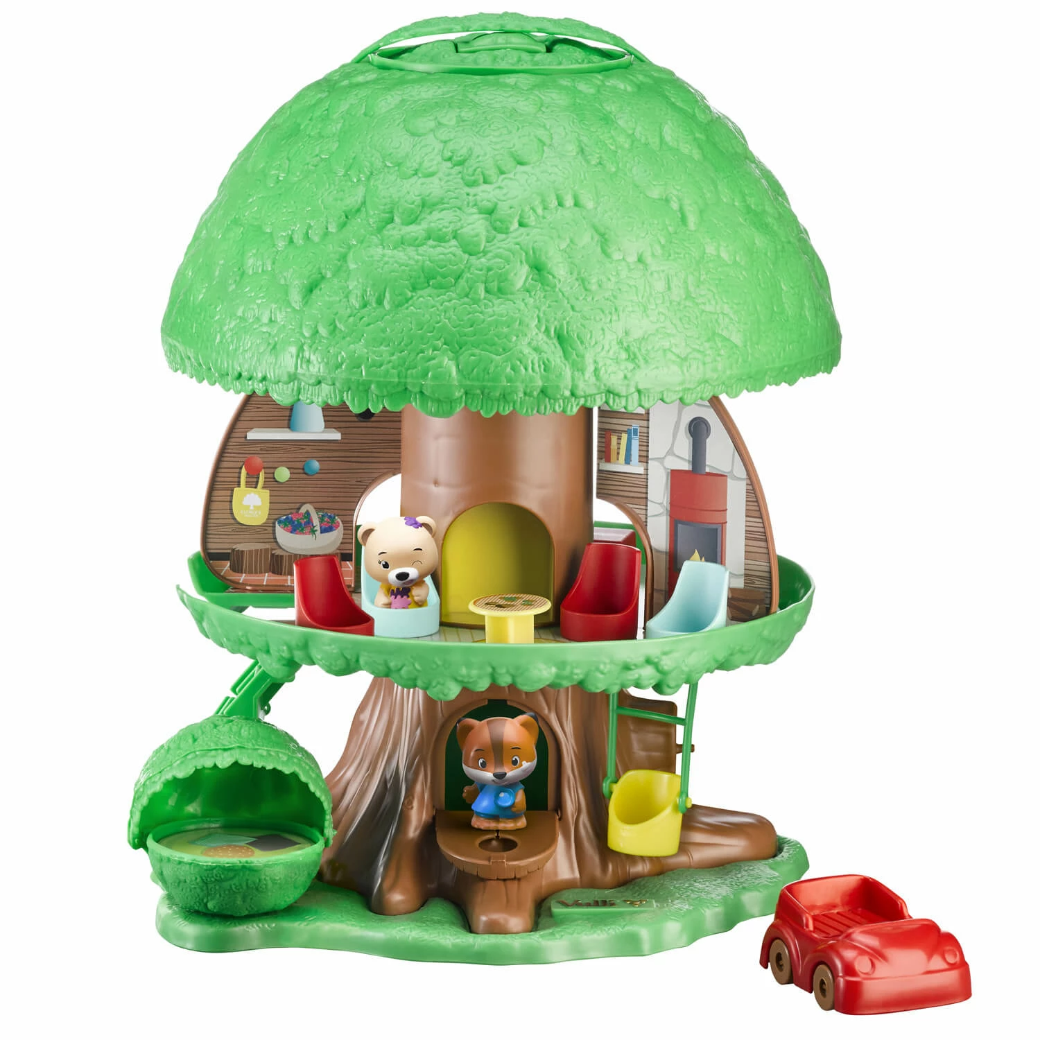 L’arbre propose de nombreuses activitĂ©s pour mettre en scène les personnages de la forĂŞt magique : une manivelle pour faire monter et descendre l’ascenseur, un buisson avec un espace repos cachĂ© Ă l’intĂ©rieur, une voiture, une balançoire… Tout pour se raconter plein d’histoires et jouer Ă plusieurs !