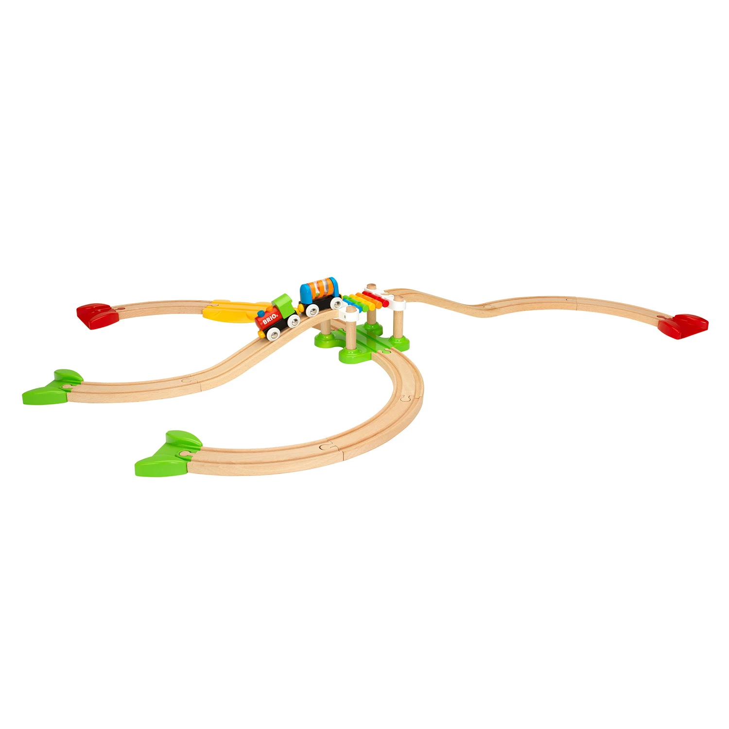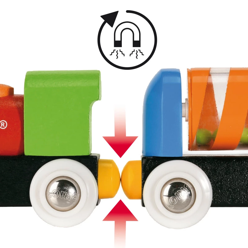 Grâce Ă l’ingĂ©nieux système d’aimants, les vĂ©hicules resteront fermement attachĂ©s, mĂŞme dans les virages les plus serrĂ©s. Les rails en montĂ©e vous permettront Ă©galement de faire passer le train sur un pont suspendu aux couleurs de l’arc-en-ciel !