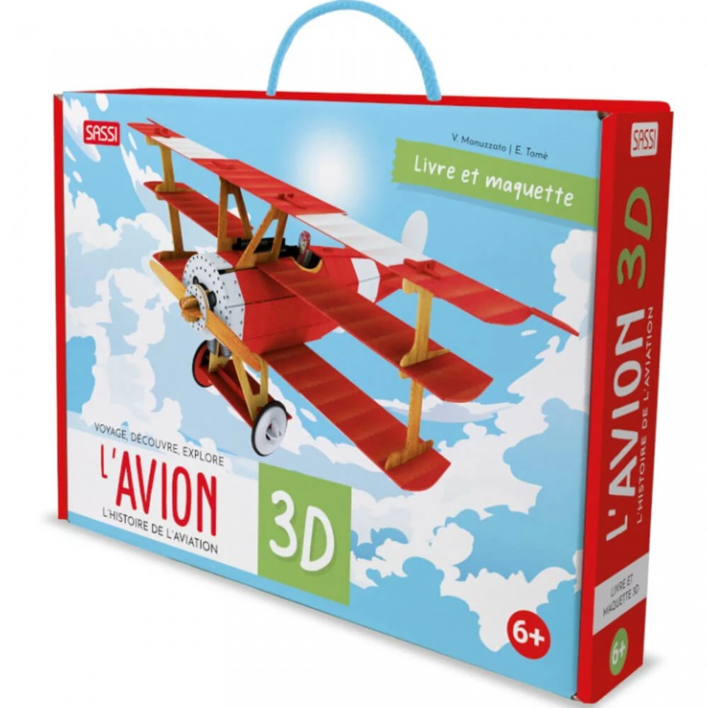 Coffret de marque Sassi avec une maquette 3D Ă construire et un livre sur l’histoire de l’aviation.