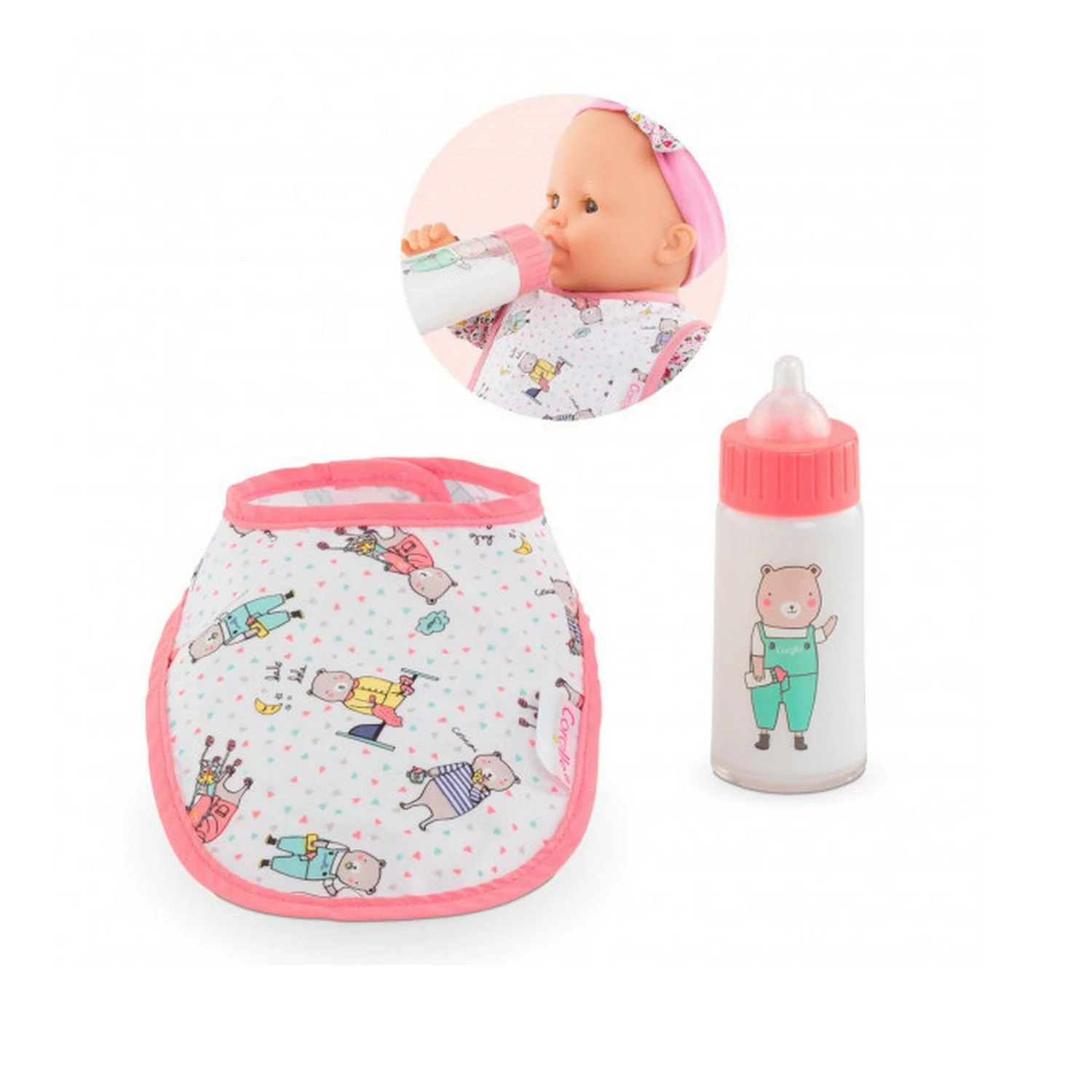 L’ensemble Bavoir & Biberon Magique est indispensable pour s’occuper de son grand poupon Corolle de 36 Ă 42 cm comme les grands ! On met le bavoir Ă son bĂ©bĂ© pour protĂ©ger ses vĂȘtements et on lui donne son repas avec le biberon magique.