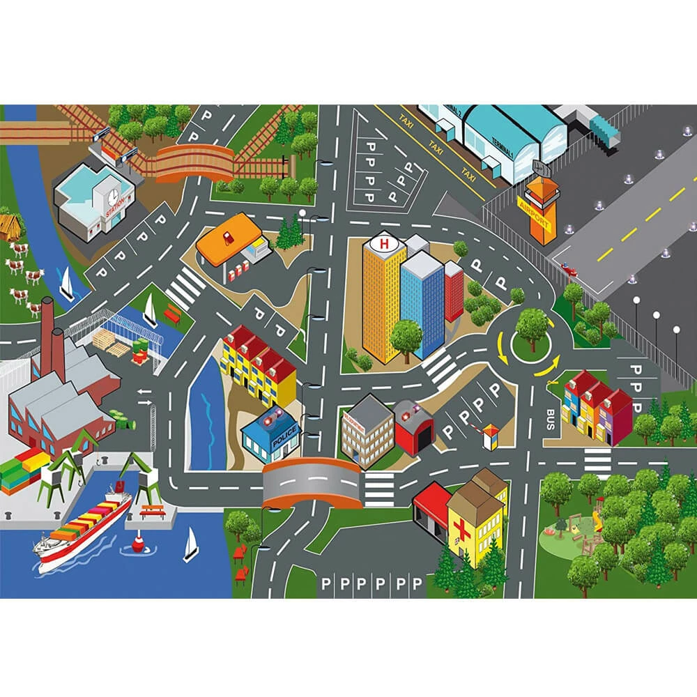 Avec ce tapis circuit imprimĂ© de dessins reprĂ©sentant des rues et des quartiers allant dans plusieurs directions, vous allez pouvoir vous inventer de nombreuses histoires avec fluiditĂ© du trafic ou non… De grand format, il permet de dĂ©ployer tout votre parc de vĂ©hicules.