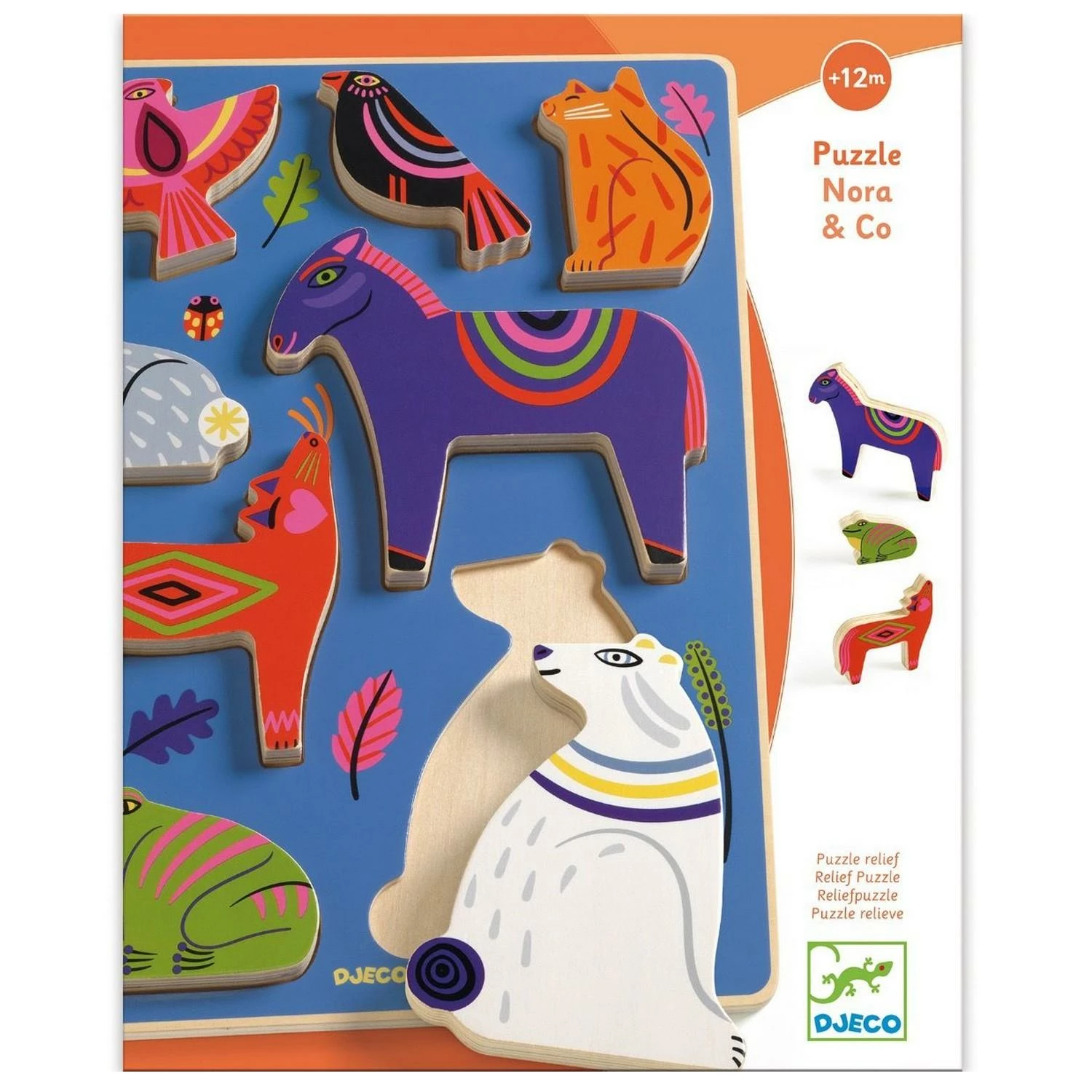 Nora & Co est un puzzle en bois facile Ă assembler sur le thème des animaux de la forĂŞt. Les pièces en relief permettent Ă l’enfant de jouer avec les animaux. Des pièces larges qui sont faciles Ă attraper pour les petits. Les animaux tiennent debout, pour encore plus de jeu ! Vendu dans une boĂ®te : pratique pour offrir et pour ranger.