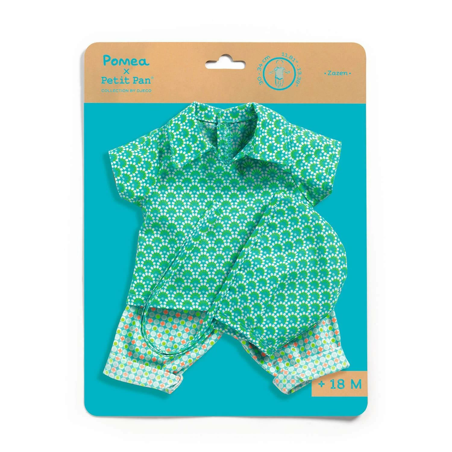Ensemble de vêtements pour poupon Poméa de la marque Djeco comprenant une tenue printanière et légère en tissu double gaze 100 % coton.