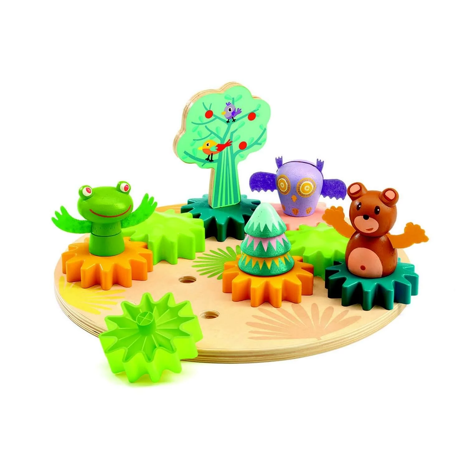 Sur un plateau en bois, recréez une forêt avec les 8 engrenages en plastique ainsi que les personnages et objets de décorations. Ours, hibou, grenouille seront là pour jouer avec toi.