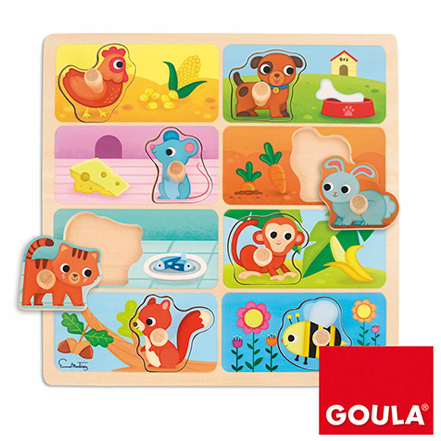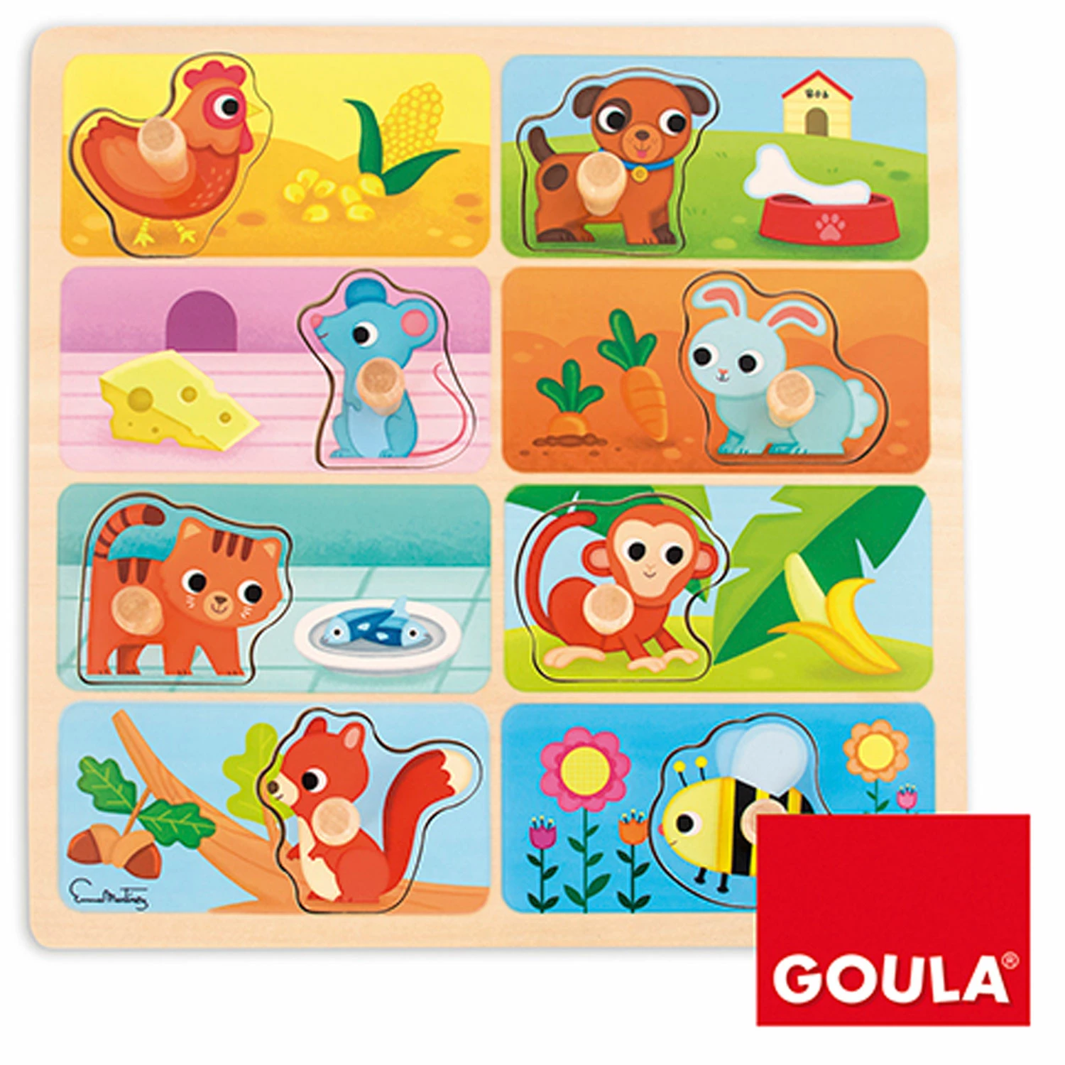 Les petits en général aiment les animaux, ils veulent en avoir et s’en occuper, au début…. Avec ce puzzle, ils vont découvrir ce que mangent leurs animaux préférés. La poule aime le maïs, le chien les os, la souris le fromage, le lapin les carottes, le chat le poisson, le singe la banane, l’écureuil les noisettes et l’abeille les fleurs.