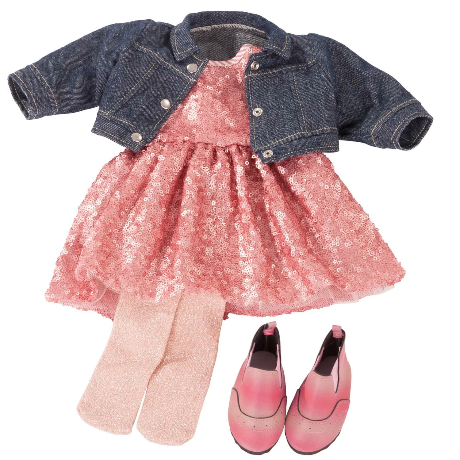 Cet ensemble est composé d’une robe Glitter à sequins roses, d’une veste imitation jean, d’une paire de collants brillants rose pâle et d’une jolie paire de chaussures assorties. Avec cette tenue, votre poupée sera la plus jolie pour sortir !