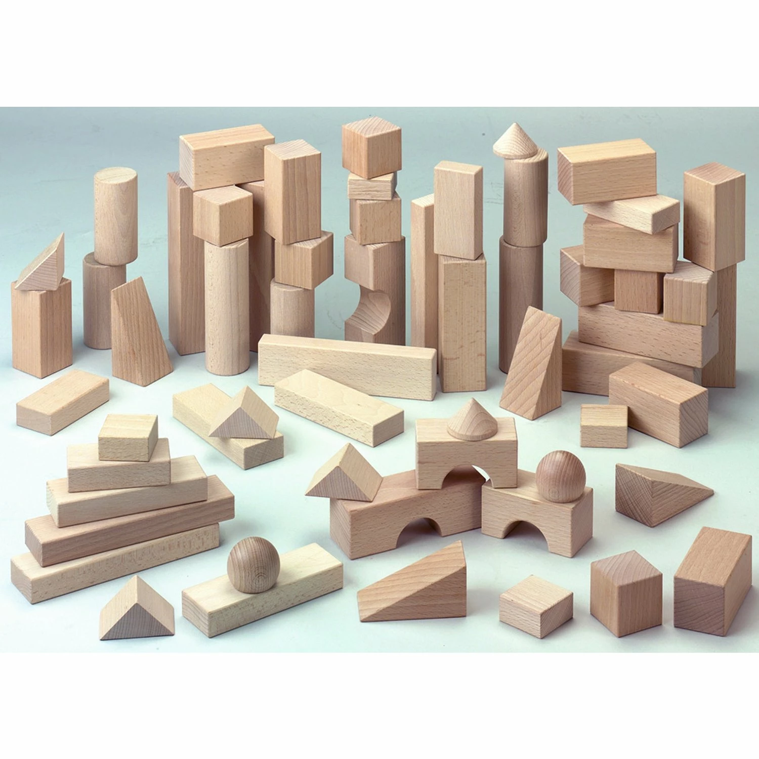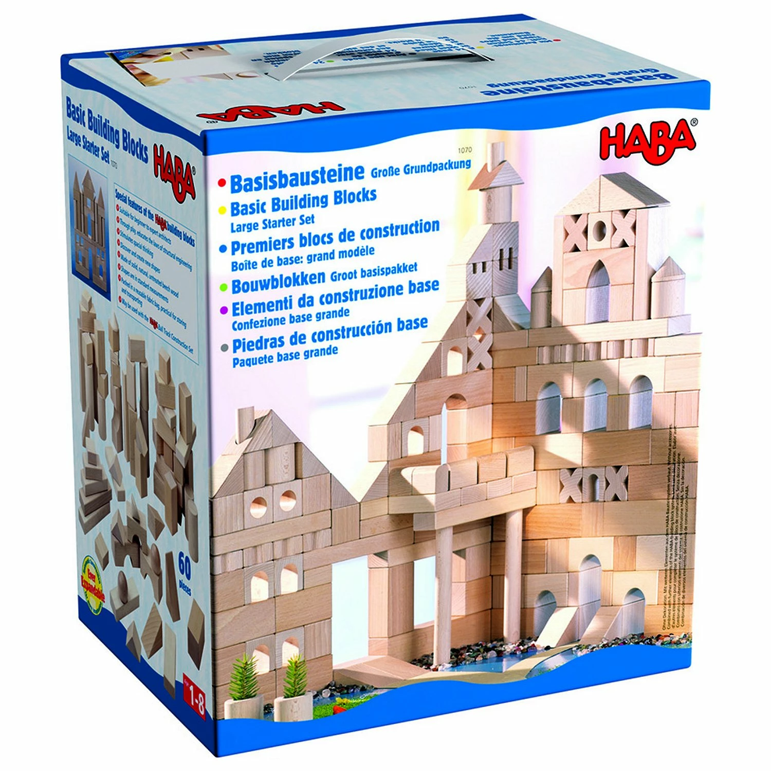 Haba propose tout un système de construction en hêtre naturel non traité : la boîte de base moyen format comprend 60 pièces pour bien commencer ses réalisations.