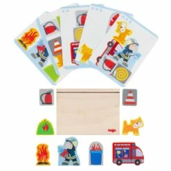 Au feu ! Pin pon ! Vite arrivés et vite empilés ! Le pompier et tous les autres éléments se placent et s’empilent à volonté sur la base. Soit librement, soit en suivant le modèle avec différents niveaux de difficulté. Pompiers, à vos tuyaux !