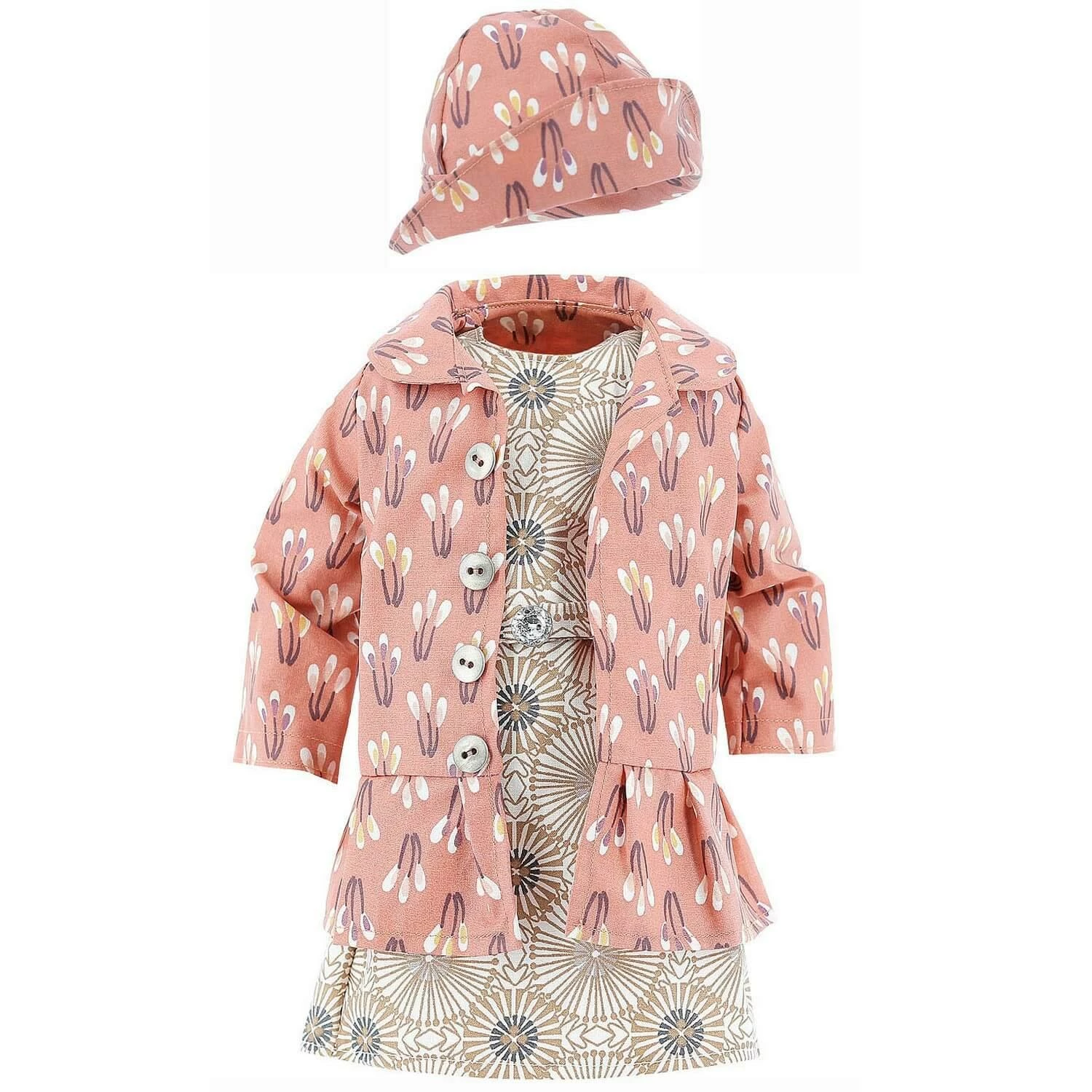La tenue se compose d’une robe, d’une veste longue et d’un chapeau rose. Le chapeau est la veste ont le mĂȘme imprimĂ© dans les tons roses, la robe est dans les tons beige. Il y a un volant sur le bas de la veste.