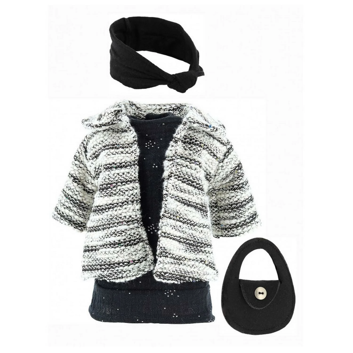 La tenue se compose d’une robe noire, d’un gilet gris et blanc, de bottes noires, d’un sac et d’un bandeau noirs.