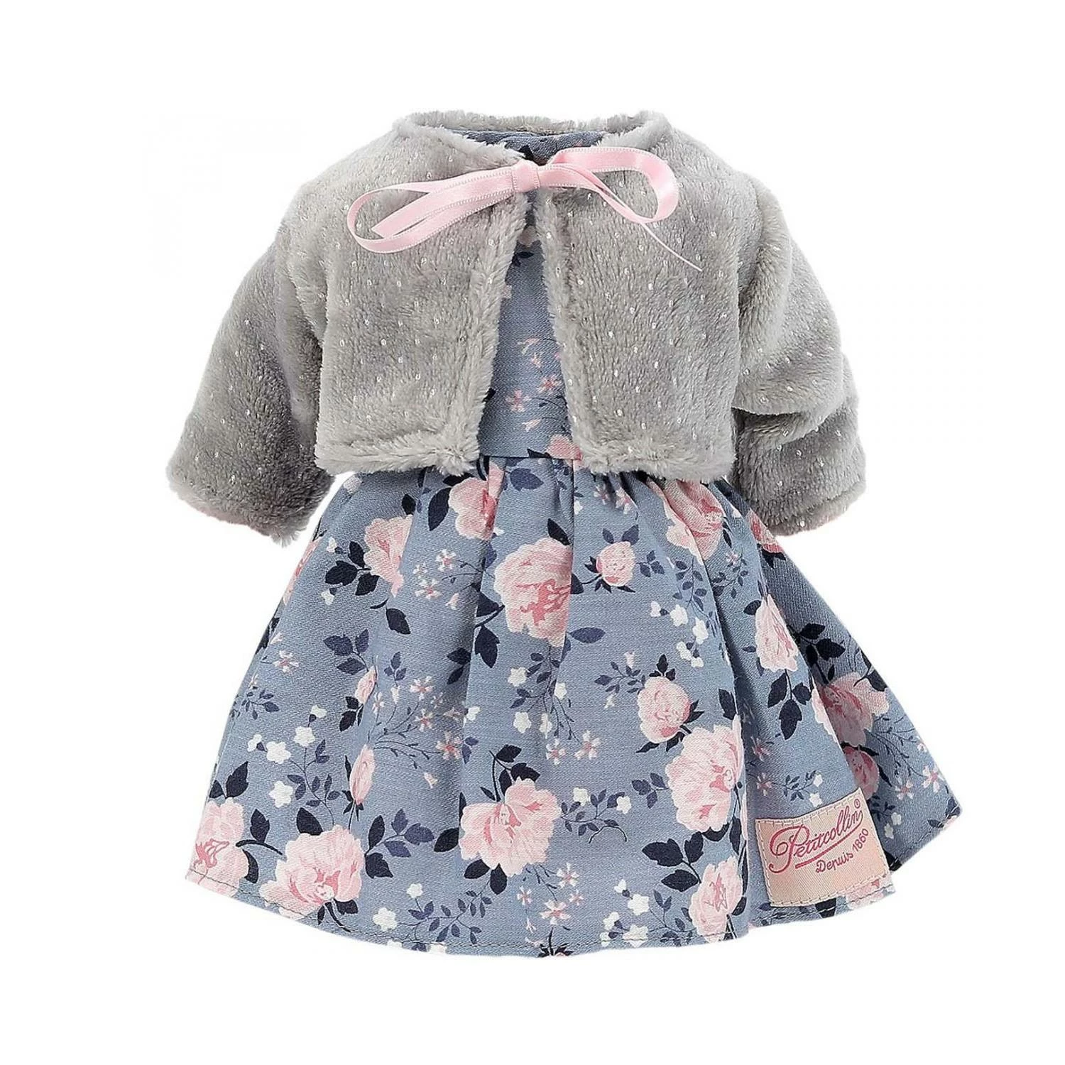 Cette tenue est composĂ©e d’une jolie robe sans manche trĂšs tendance avec son motif fleuri aux couleurs indigo et d’un gilet gris pĂąle en tissu velours tout doux. Le gilet est dĂ©corĂ© de petits points brillants argentĂ©s et se ferme grĂące Ă un ruban de satin rose assorti Ă la couleur des roses de la robe.