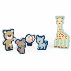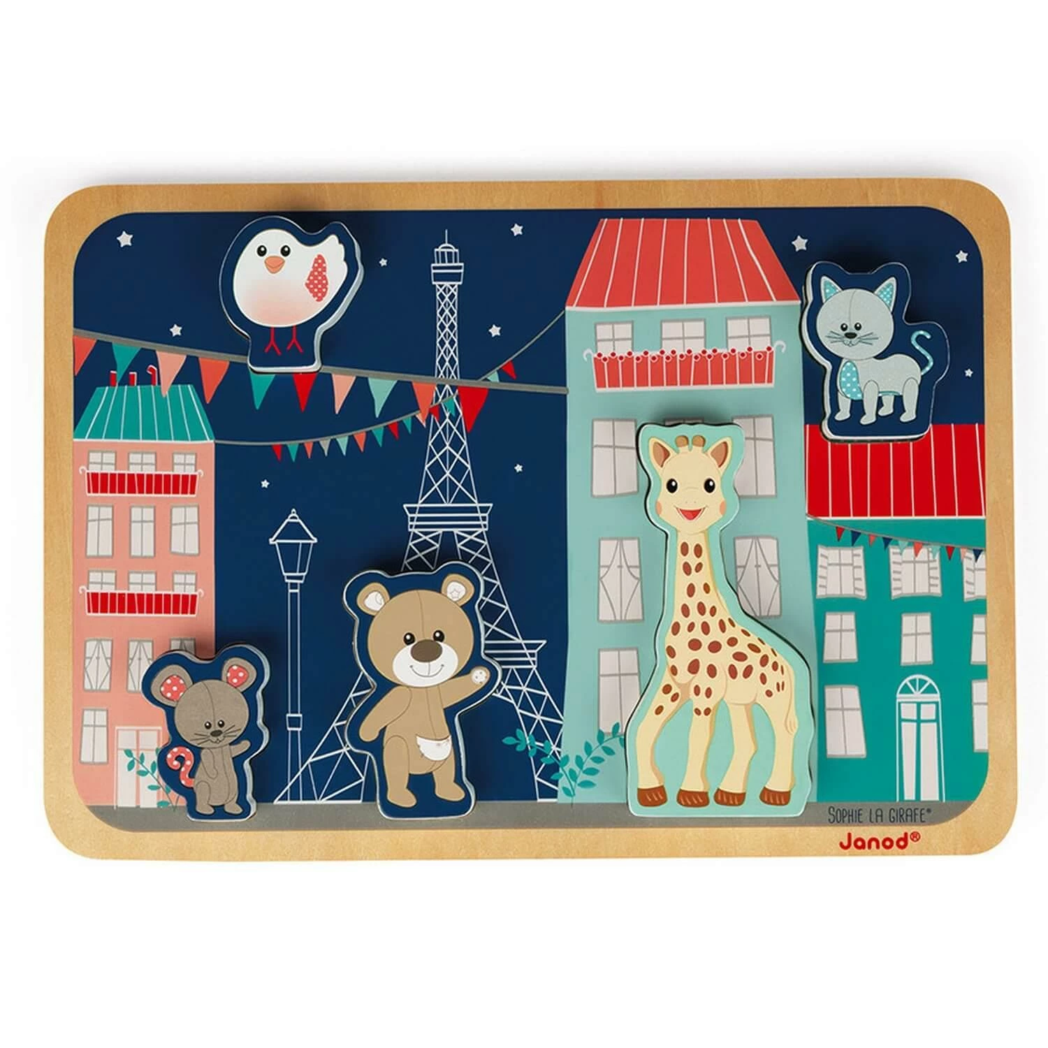 Découvrez ce magnifique puzzle avec le célèbre personnage Sophie la Girafe et ses amis dans un joli décor parisien.