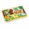 Puzzle d’Ă©veil en bois sur le thème “L’Arche de NoĂ©”. Plateau en forme originale de bateau. Pièces Ă tenons pour faciliter la prise en main.