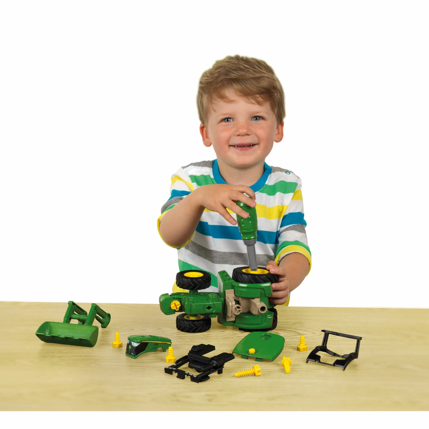 L’enfant va adorer monter et dĂ©monter les deux vĂ©hicules avec l’aide de son super tournevis. Ces deux vĂ©hicules sont sous la marque John Deer, de couleurs vert, jaune et gris.