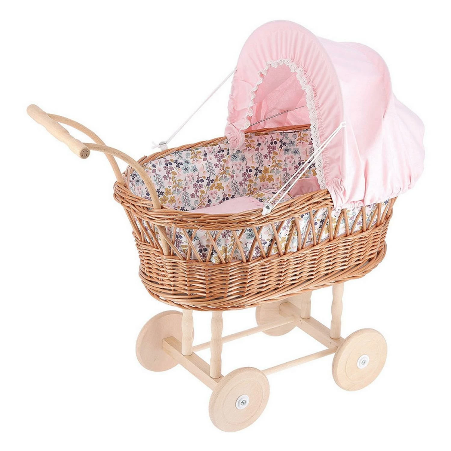 Landau en osier pour poupĂ©e jusqu’Ă 40 cm environ. Le chĂąssis et les roues sont en hĂȘtre massif. De plus, le tissu Ă l’intĂ©rieur est rose avec des motifs fleurs. Le landau est fabriquĂ© En Europe.