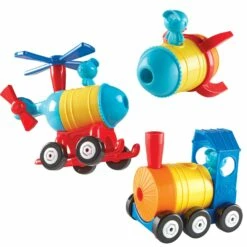 L’ensemble coloré permet aux enfants de construire trois de leurs véhicules préférés (un à la fois). Les pièces s’assemblent pour créer chaque véhicule : fusée, locomotive et hélicoptère. Faciles à assembler, les grosses pièces sont idéales pour les petites mains. Les enfants utilisent la clé à molette pour “serrer” chaque projet.