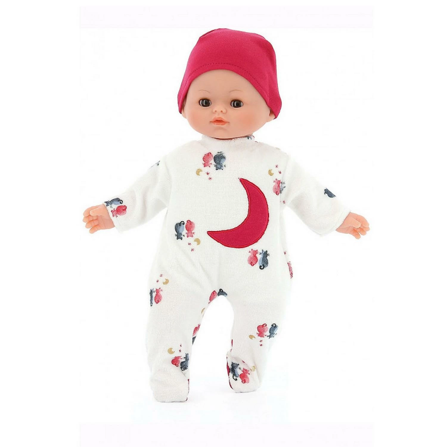 Poupon Petit Câlin 36 cm avec habillage “Charlie”. La tĂŞte, les bras et les jambes en vinyle sont souples et ont un dĂ©licat parfum de vanille. Le corps est en tissu. Les yeux dormeurs du poupon sont bruns et ses cheveux sont peints en blonds. Sa tenue se compose d’un pyjama blanc et d’un bonnet rouge. Il est fabriquĂ© en Europe. Photos non-contractuelles
