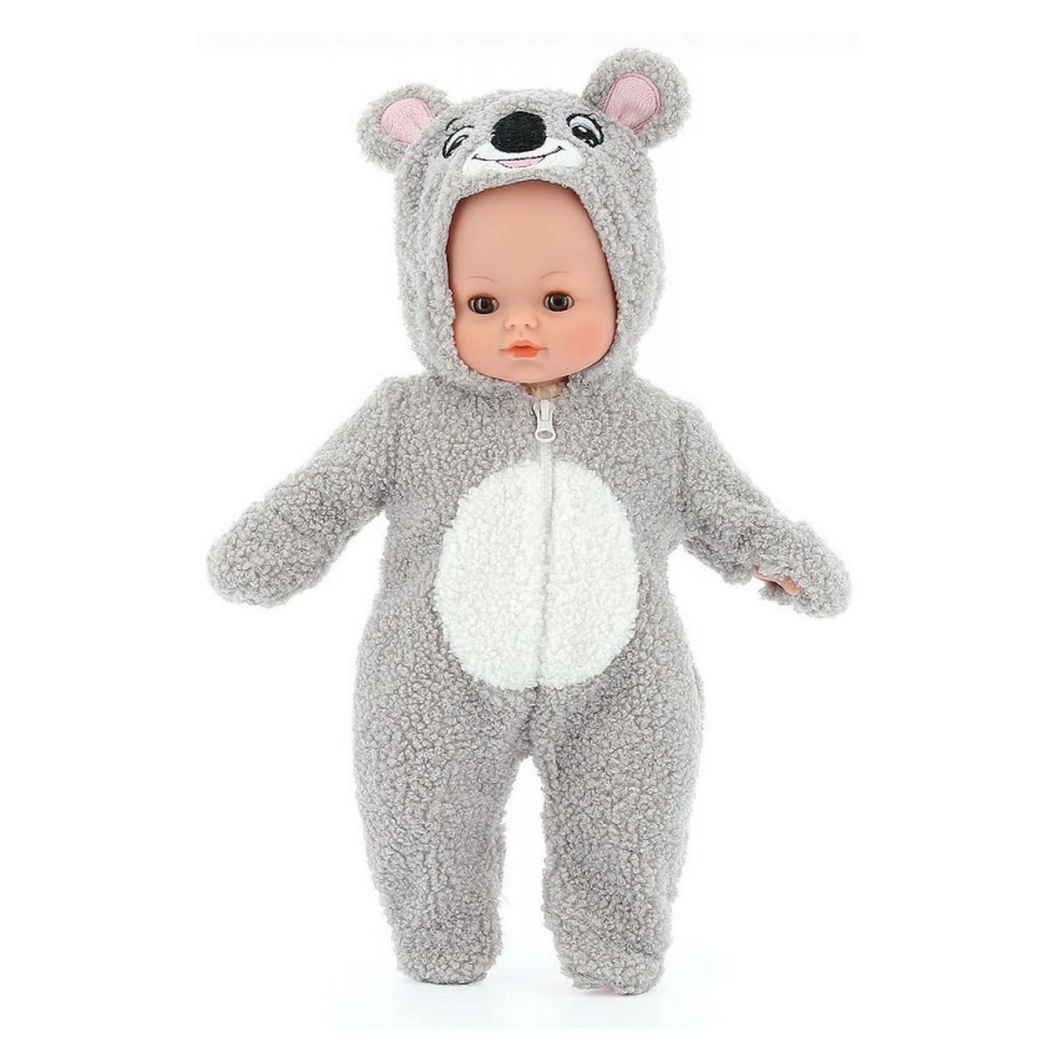 Poupon Petit Câlin 36 cm avec habillage “Nina-Koala”. La tĂŞte, les bras et les jambes en vinyle sont souples et ont un dĂ©licat parfum de vanille. Le corps est en tissu. Les yeux dormeurs du poupon sonbt bruns et ses cheveux sont peints en blonds. Il est fabriquĂ© en Europe. Photos non-contractuelles