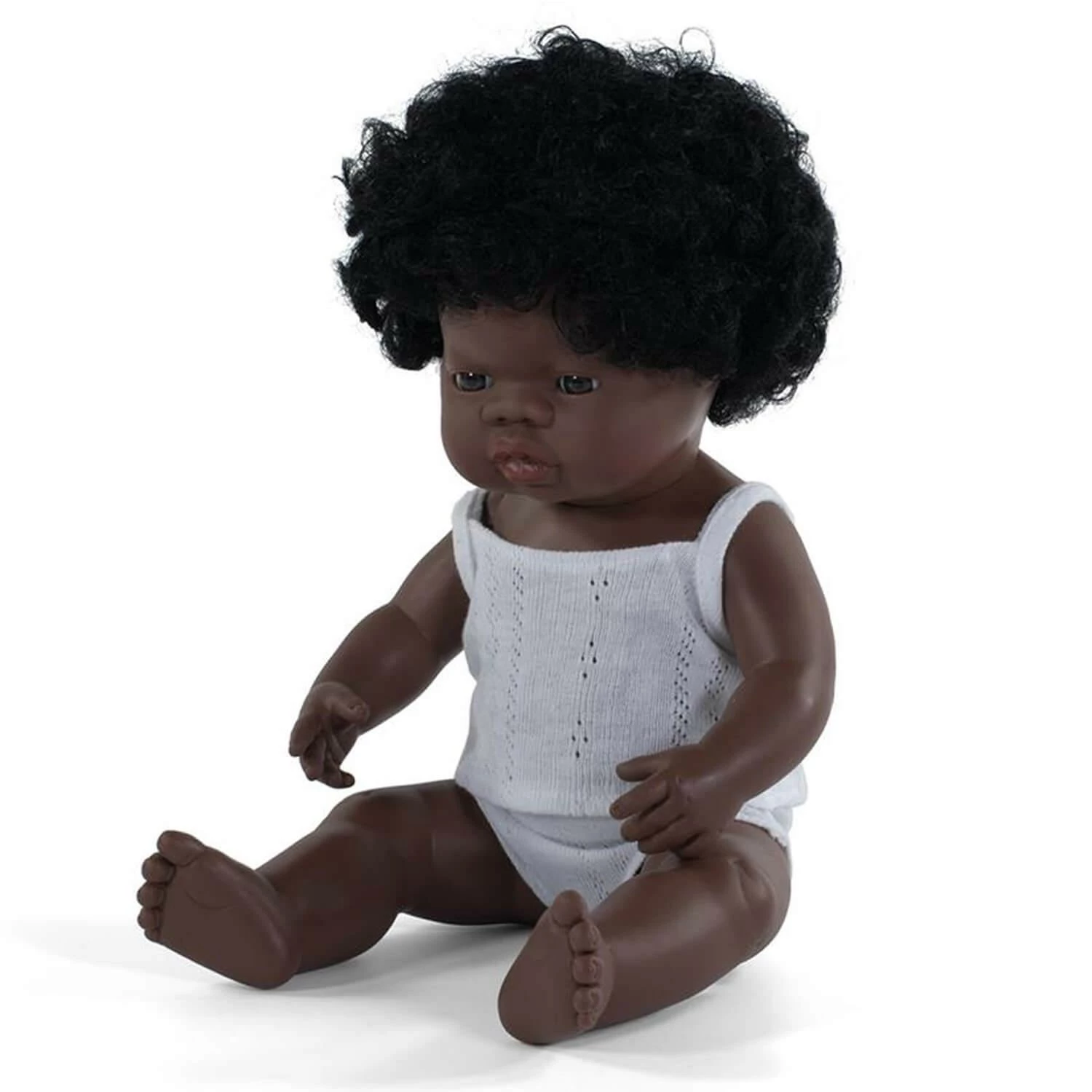 Cette poupĂ©e fille africaine, fait partie de la collection Miniland Dolls, qui promeut des valeurs d’Ă©galitĂ© et de diversitĂ©.