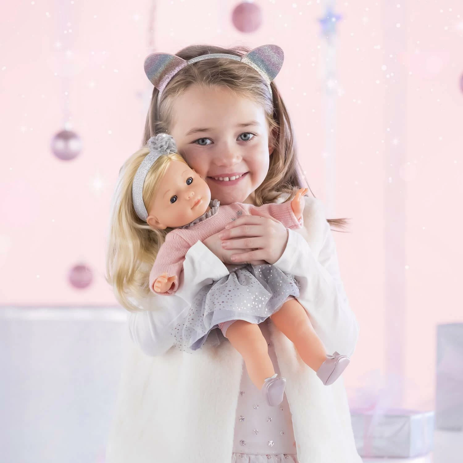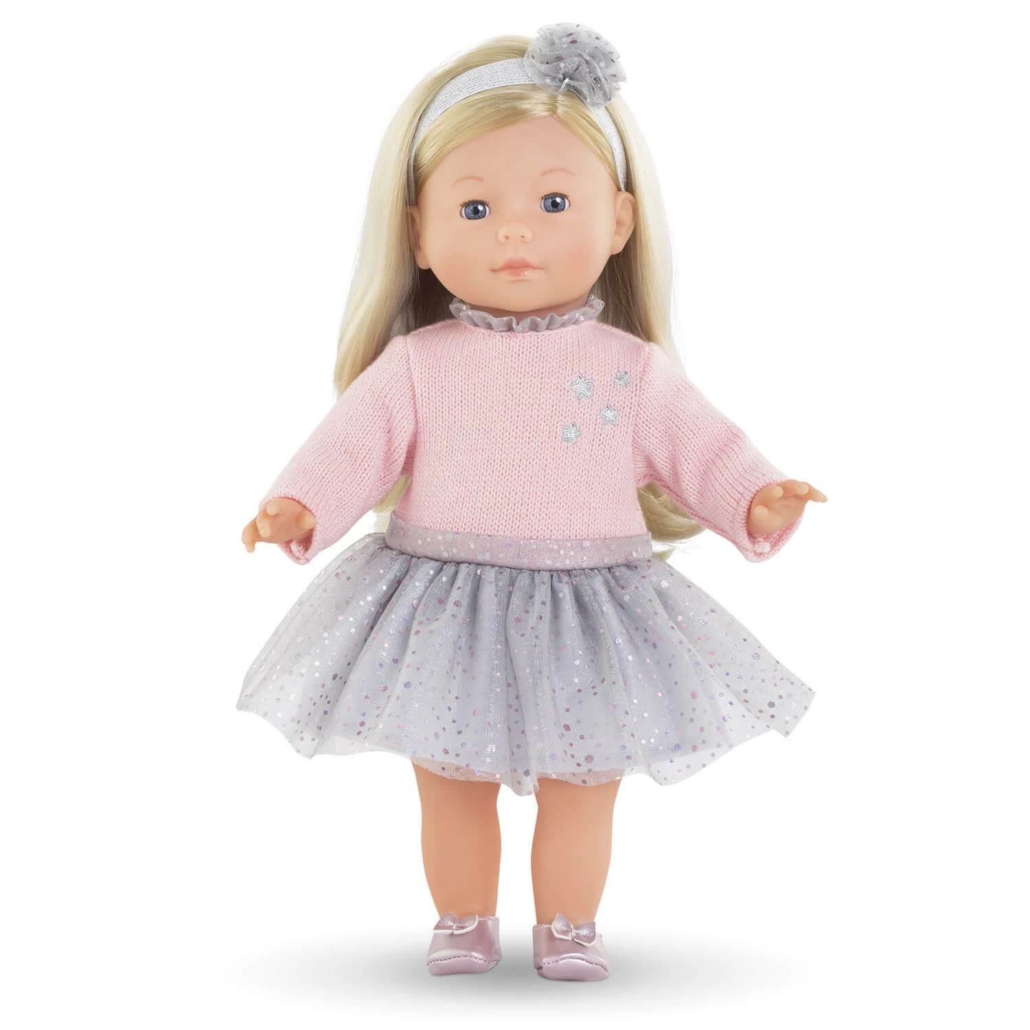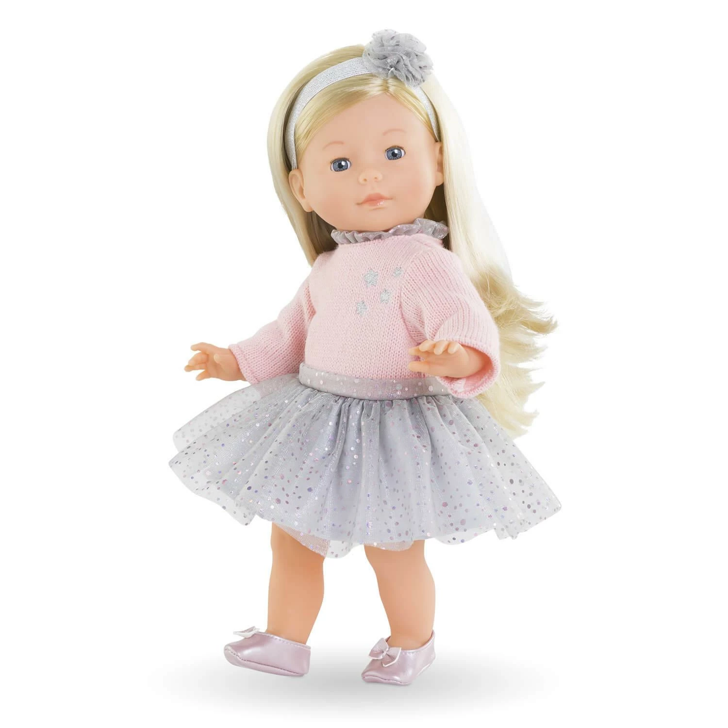 Elle est habillée d’une robe à manches longues. Elle est coiffée d’un bandeau assorti et est chaussée d’une paire de ballerines rose.