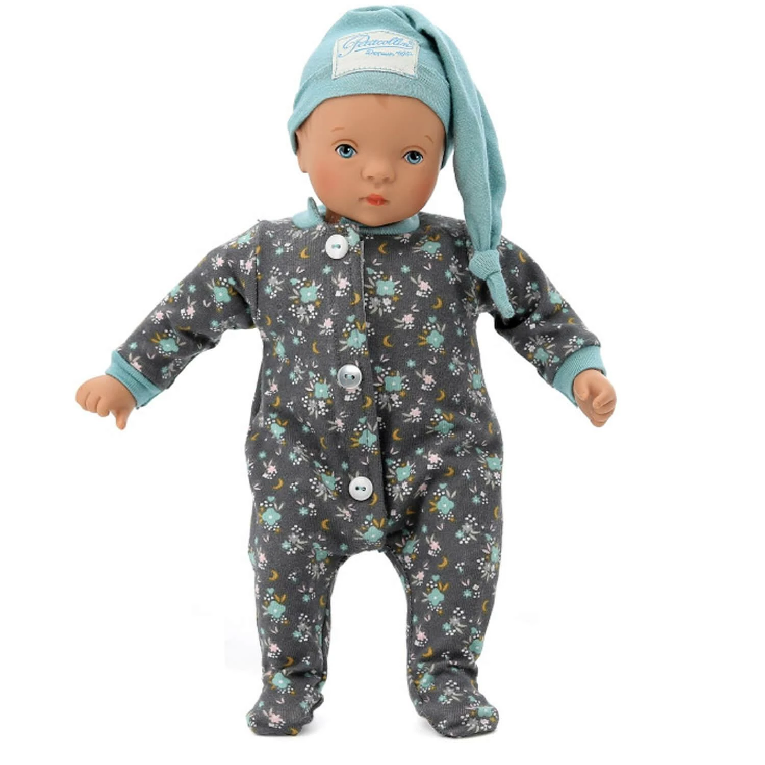 La poupĂ©e Pauline est vĂŞtue d’un pyjama bleu Ă fleurs et son bonnet de nuit bleu