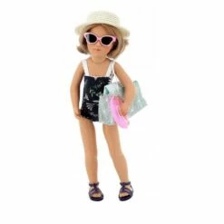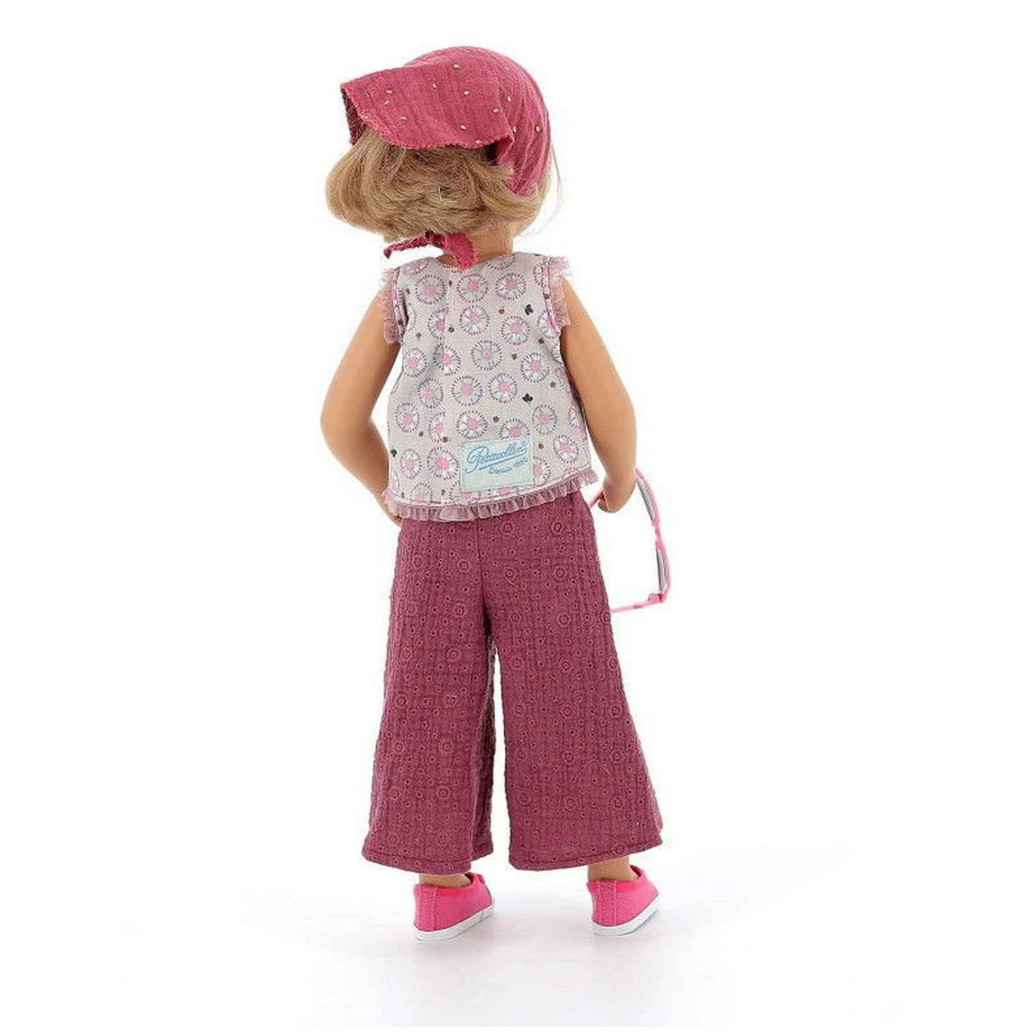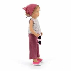 Cette poupĂ©e Starlette Carla porte une très jolie tenue d’Ă©tĂ©, chic et fĂ©minine composĂ©e d’une blouse sans manche en coton imprimĂ© avec biais volantĂ© en organza couleur parme, portĂ©e sur un pantalon bordeaux. La tenue est complĂ©tĂ©e par un foulard en coton lavĂ© nouĂ© dans les cheveux, des lunettes de soleil et des chaussures en toile roses avec noeud plat. Une deuxième tenue pour la plage est fournie avec cette poupĂ©e, elle comprend un joli maillot de bain, un chapeau en paille, un sac de plage et des sandales violettes.  Â
