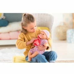 Émilie mesure 36cm, une taille parfaitement adaptĂ©e aux petits bras de l’enfant pour la câliner, la materner et imiter les gestes qui font devenir grand.