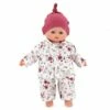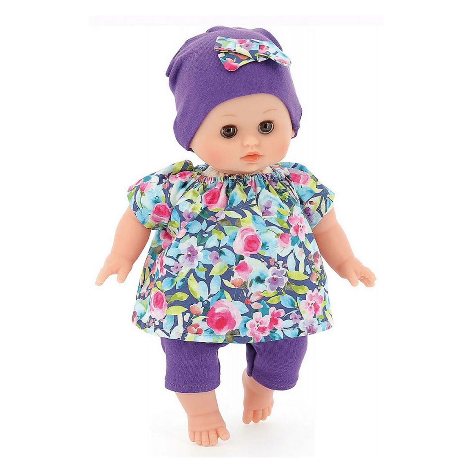 Bienvenue à la jolie petite Primevère. Avec sa tenue violette aux couleurs estivales, cette poupée aux cheveux peints blonds va égayer les chambres des petits et des grands. Regarde comme ses yeux bruns se ferment lorsque tu l’allonges dans son lit. Sa tenue est composée d’un bonnet, d’un legging et d’une blouse fleurie.
