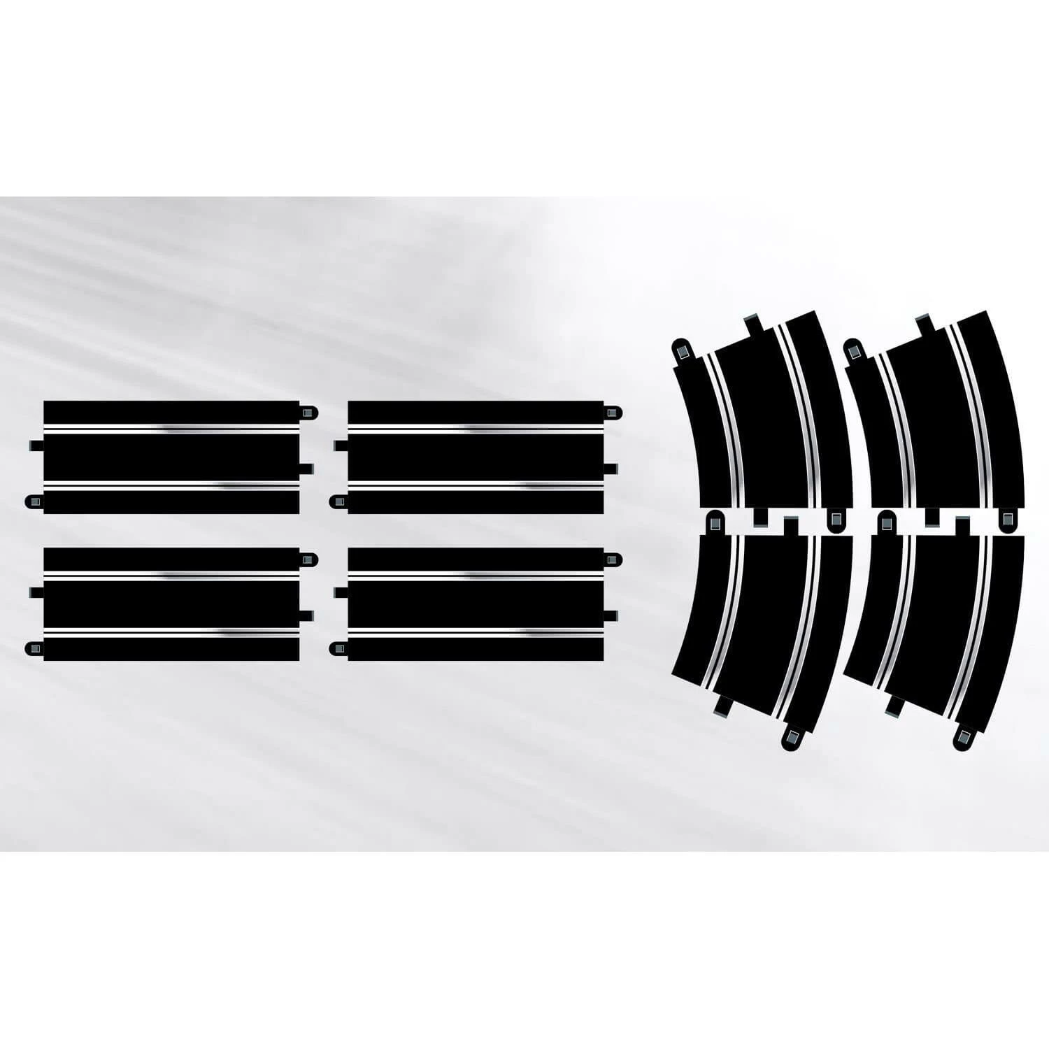 Ce set se compose d’extensions pour un circuit de voiture Scalextric et contient 4 rails droits de 350 mm et 4 rails courbes rayon 3 22,5°.