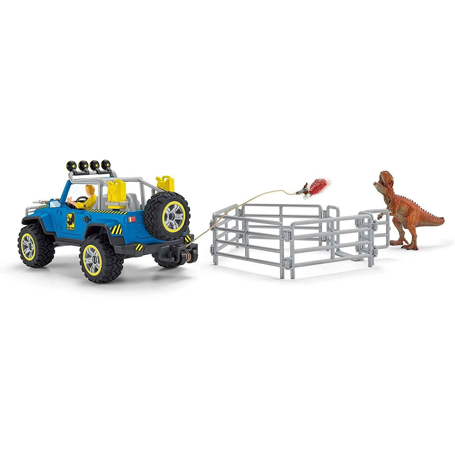 Contenu : 1 vĂ©hicule tout-terrain Ă treuil, 1 chercheur Luis, 1 giganotosaure, 1 appât, 1 hache, 1 tourniquet, 1 bĂŞche, 1 caisse en aluminium, 4 Ă©lĂ©ments de clĂ´ture, 1 portail d’entrĂ©e, 1 autocollant