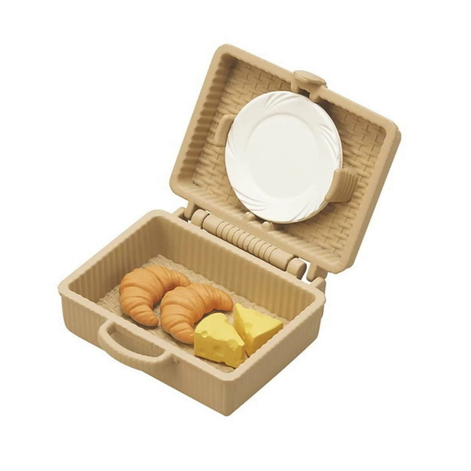 Une valisette contient le nécessaire à pique-nique composé d’un set d’assiettes et gobelets, de croissants et de fromage. Les gobelets tiennent dans la main des personnages et peuvent se ranger dans les porte-gobelets situés à l’avant du véhicule.
