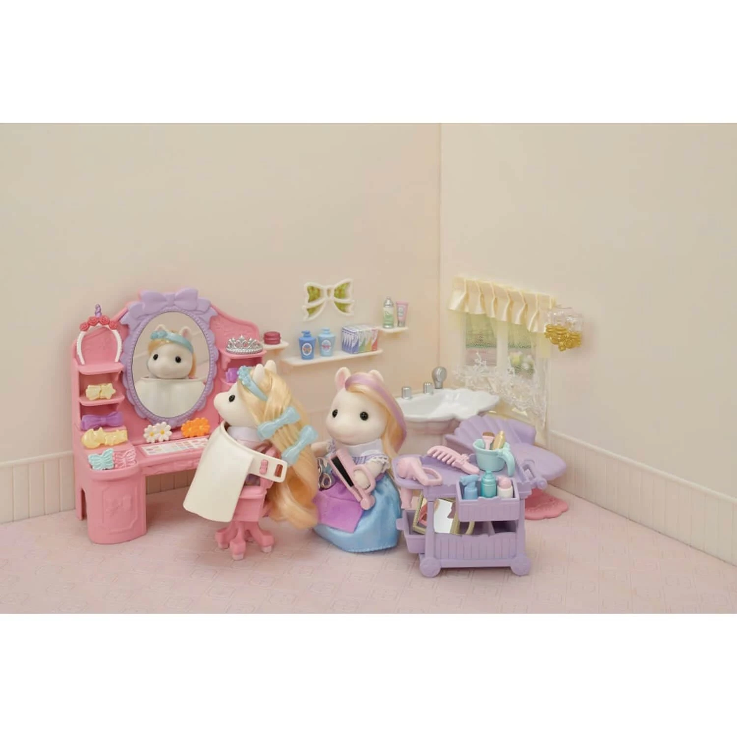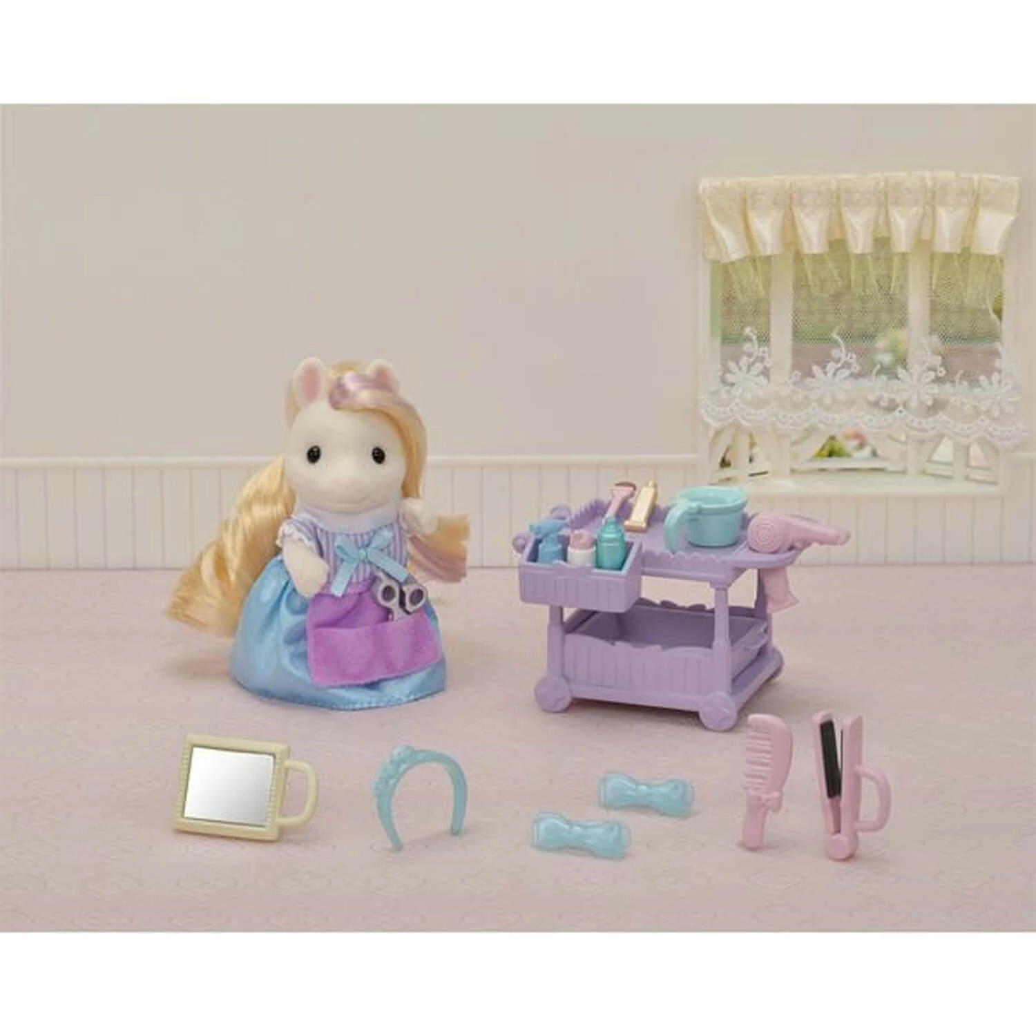 Imaginez de nouvelles histoires pour les Sylanian Families avec ce set de jeu figurine maman poney et son stand de coiffure.