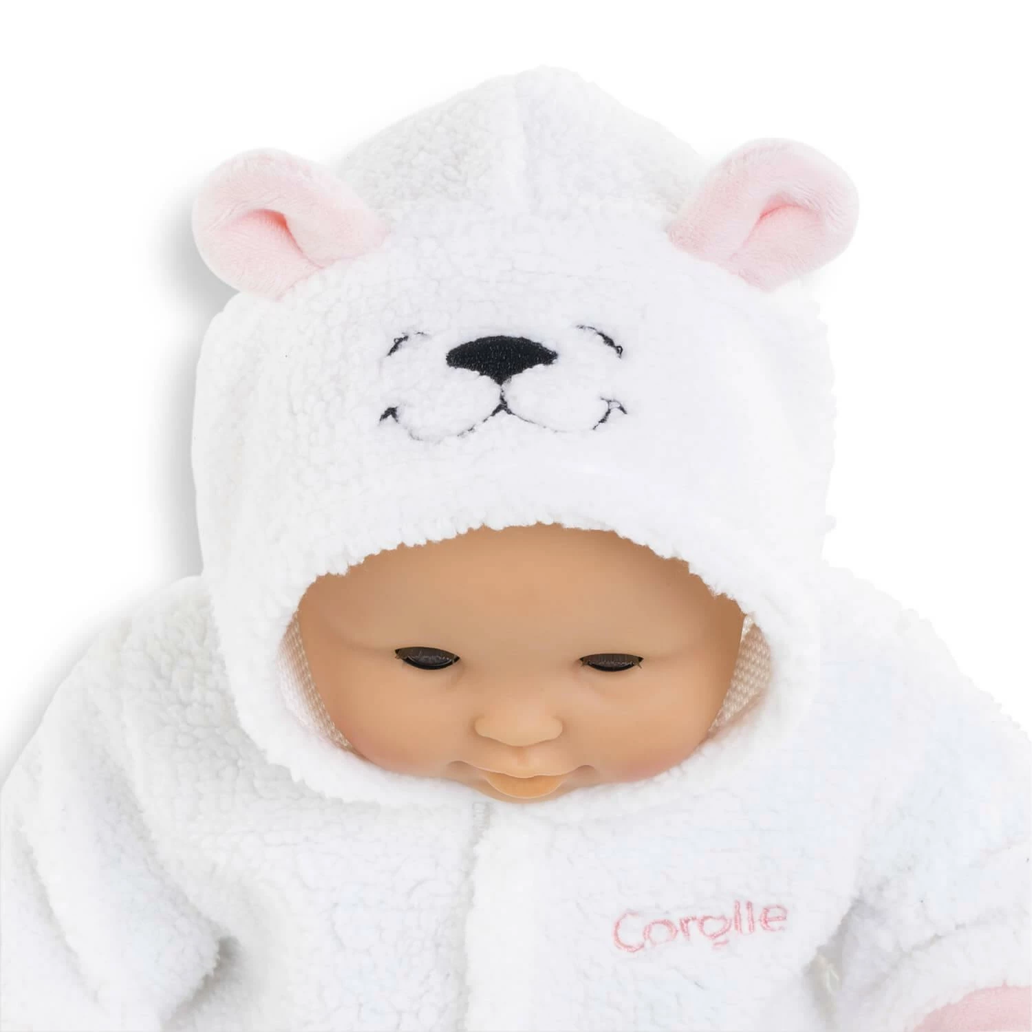Le manteau rose en fourrure toute douce est muni d’une amusante capuche à tête d’ourson avec de petites oreilles grises.