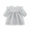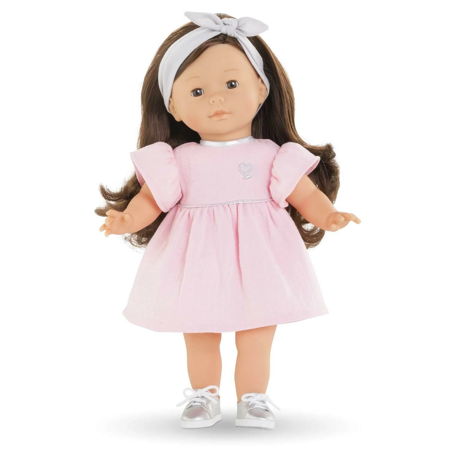 Cette tenue complète pour les poupées ma Corolle de 36 cm se compose d’une robe rose, effet gaze de coton, et d’un bandeau nœud gris clair. La robe est délicatement ornée d’un col et d’une ceinture argentés, et d’une broderie “cœur Corolle” sur le devant.