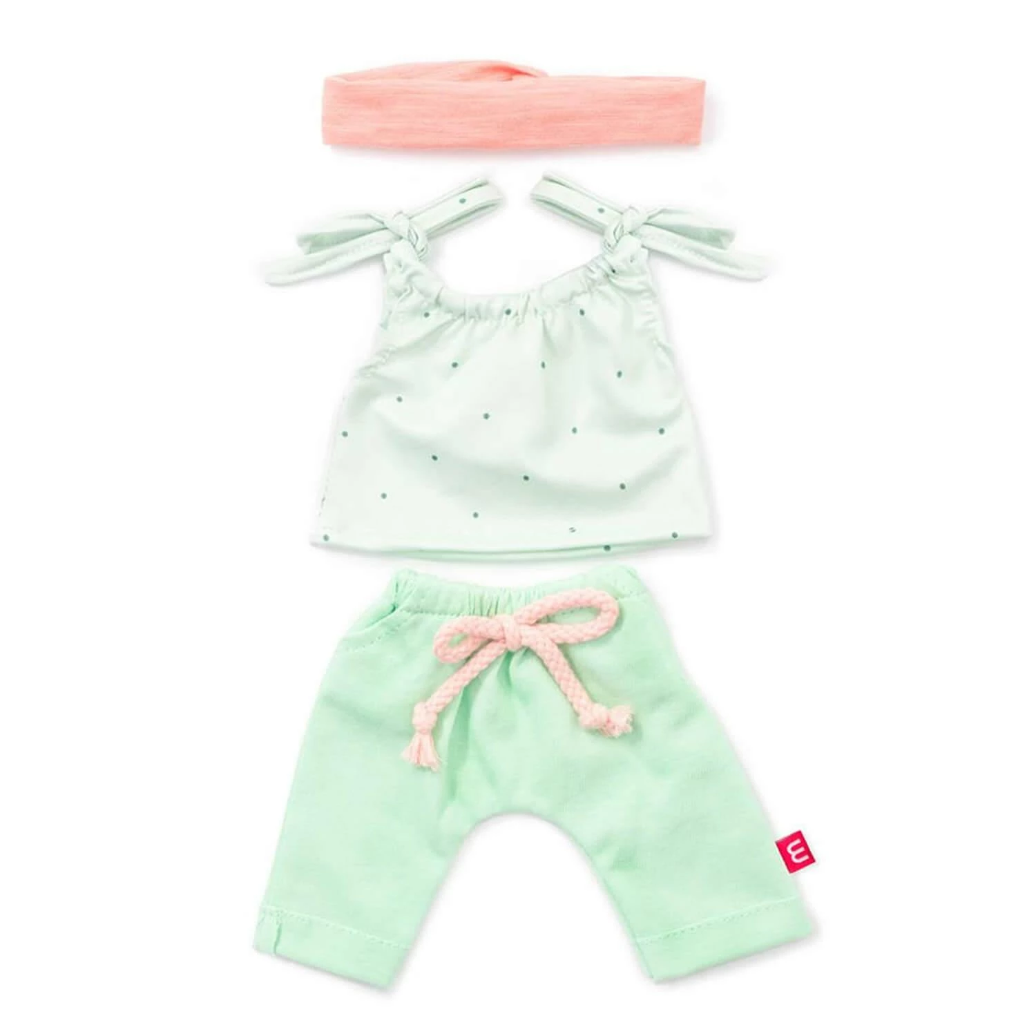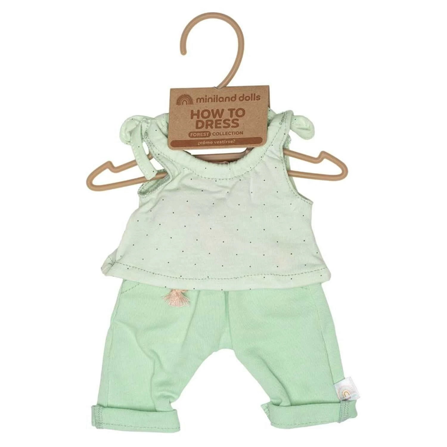 Cet ensemble de la marque Miniland convient aux poupées mesurant 38 cm. Il se compose d’un pantalon et d’un top à bretelles dans les tons vert pastel et d’un bandeau rose pastel. Il est livré avec son propre cintre pour que vous puissiez l’accrocher.