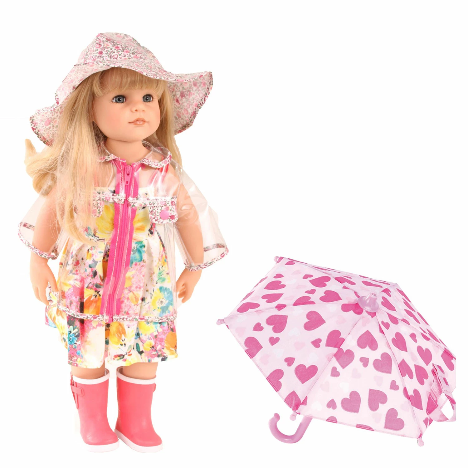 Le parapluie est rose transparent avec, pour motifs, des coeurs rose fuchsia ainsi qu’une paire de botte. Ce dernier accessoire peut aussi servir lors de ballade en forêt, même par beau temps ou pour le jardinage et bien d’autres encore ! Tant d’accessoires pour le bien-être de vos poupées préférées.