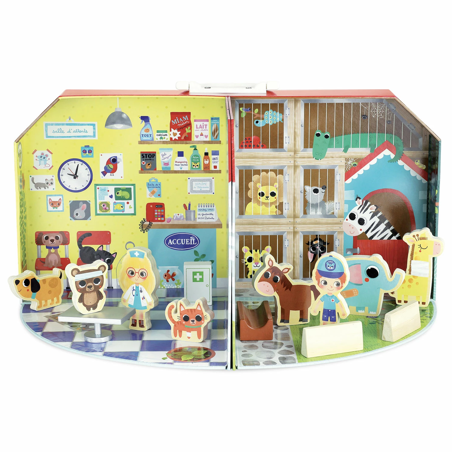 Le coffret s’ouvre très facilement et offre deux scènes : la première représente une clinique vétérinaire pour notamment les animaux domestiques et l’autre nous montre un zoo avec par exemple les animaux de la savane…