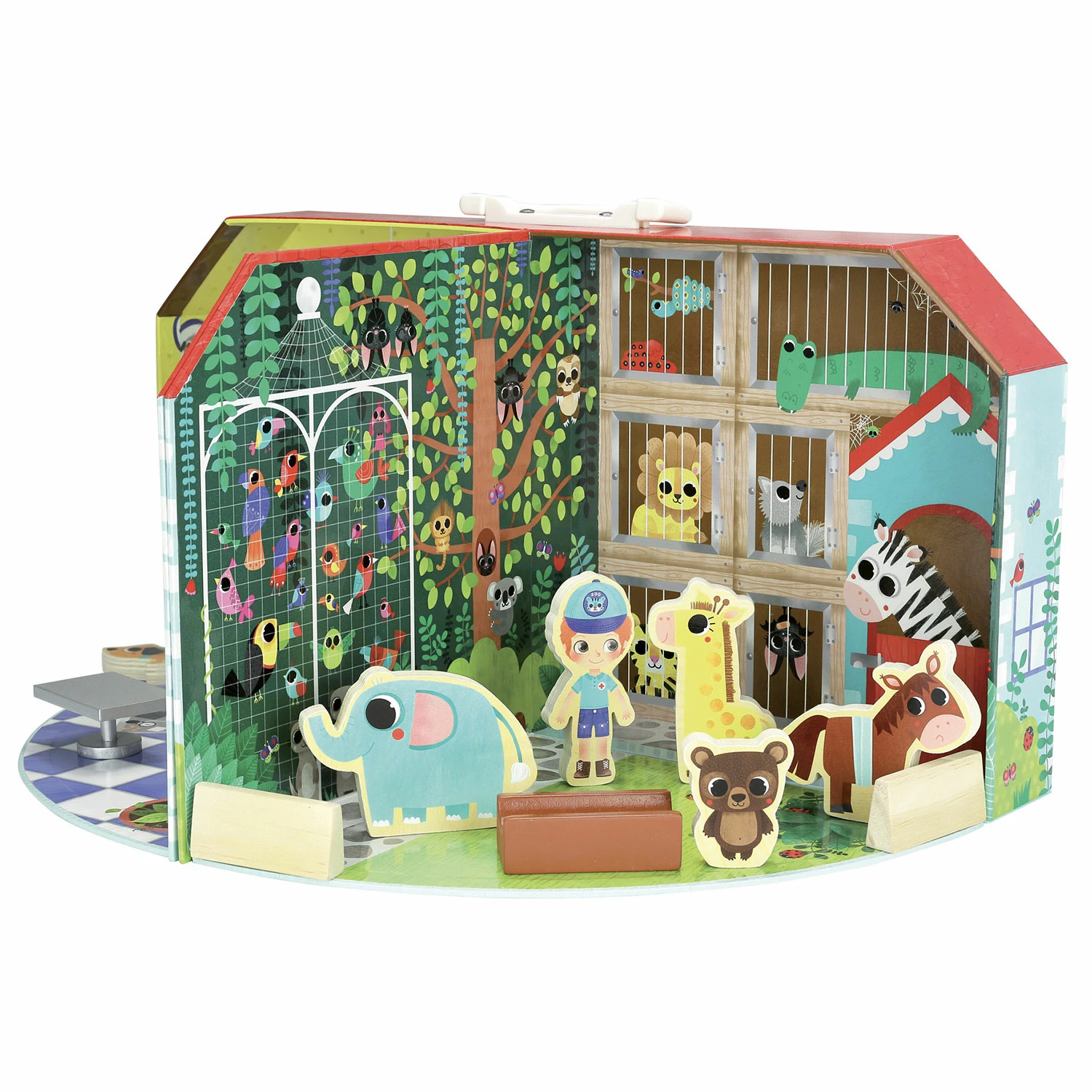 La valisette est en carton mais les accessoires (animaux, mobiliers et autres) sont en bois.